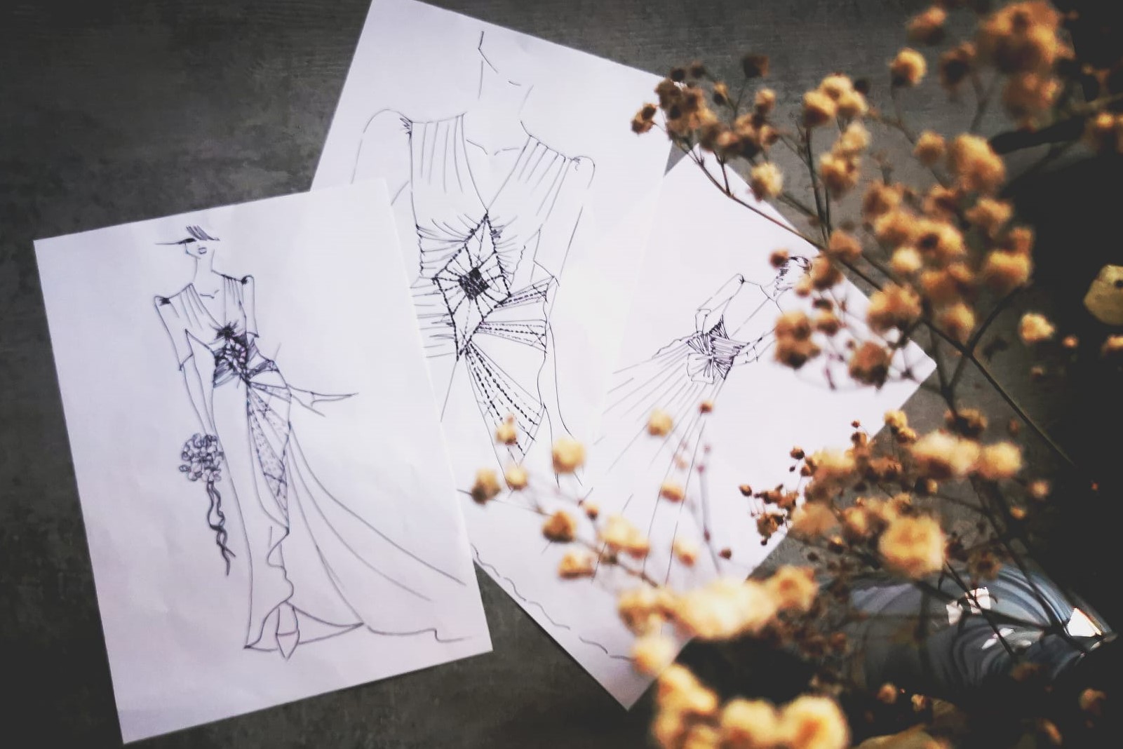 Ancora ricordo bene la scena: chiesi alla parrucchiera un foglio che prese dal quaderno del figlio mentre faceva i compiti lì accanto, presi carta e matita e iniziai a disegnare. Non ci crederai mai, ma dopo poco avevo finalmente trovato il mio abito! Un tubino con questo dettaglio del ventaglio sul fianco che tanto mi aveva affascinato.